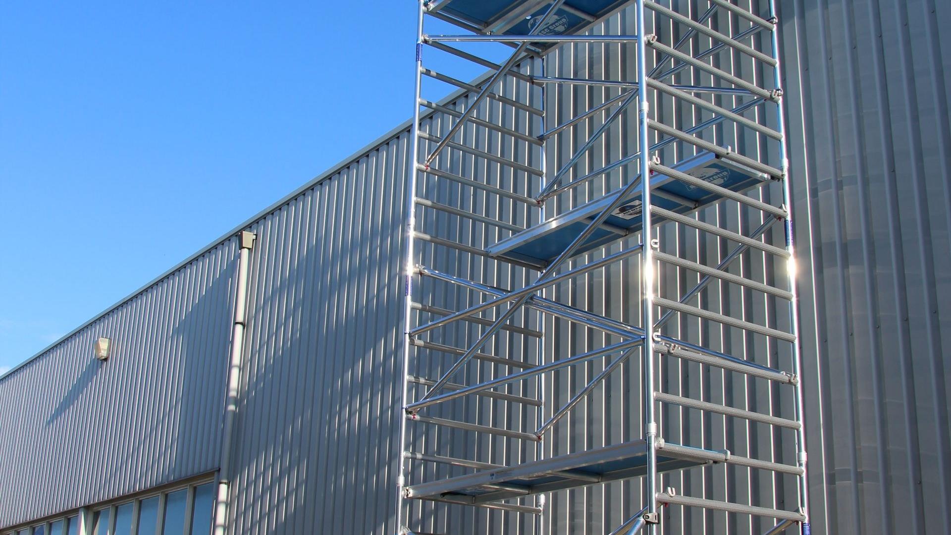 Rolsteiger Euroscaffold Professional 90x305 8,2m werkhoogte tegen de gevel. Rolsteiger van het Nederlandse merk Euroscaffold. Deze steiger voldoet aan de norm van 1 januari 2018 waarbij leuningen op heuphoogte verplicht zijn voor het betreden van het steigerplatform. De rolsteiger beschikt over enkelzijdige voorloopleuningen.